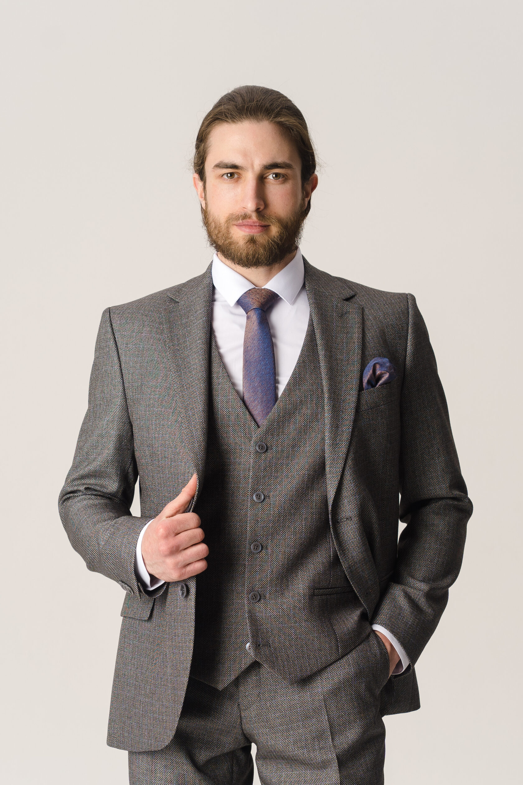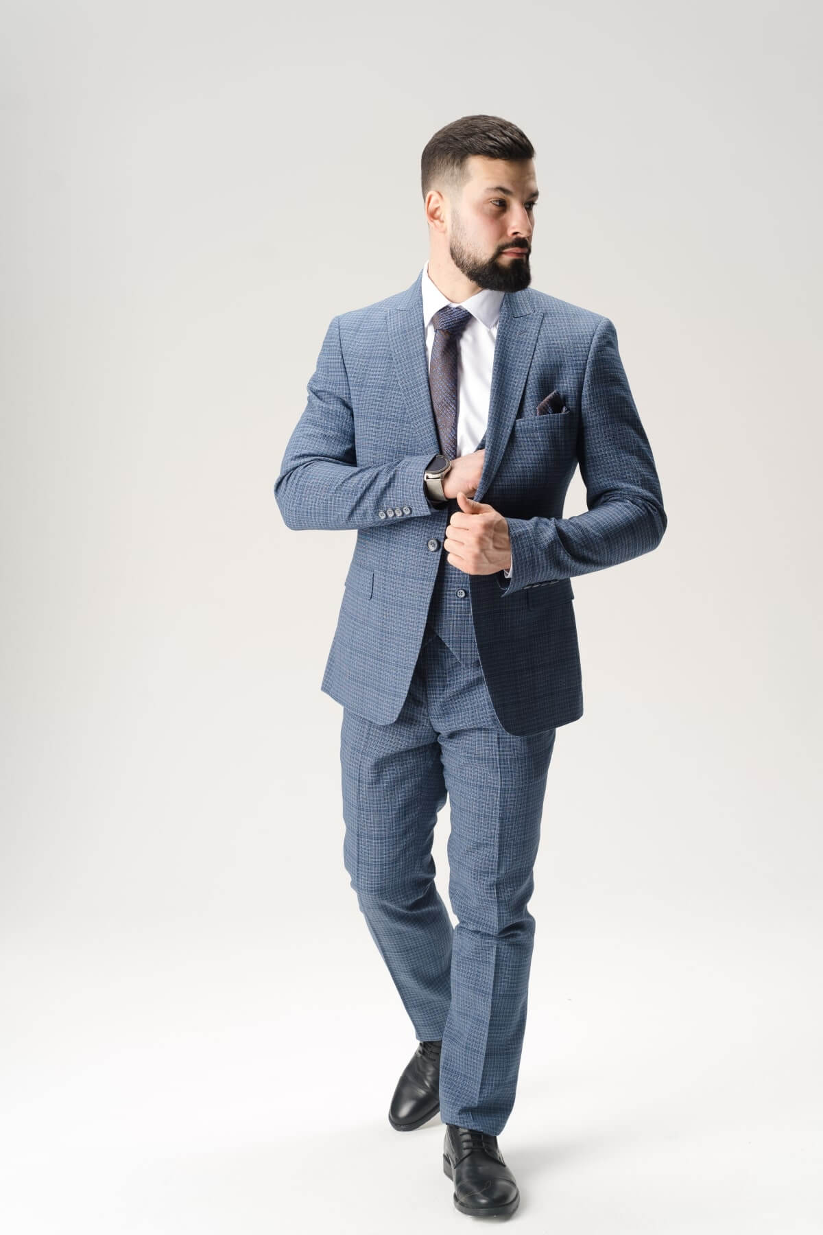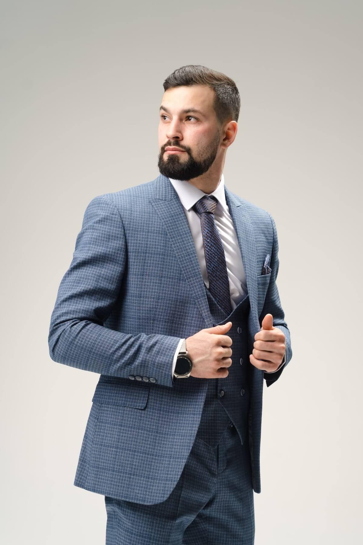 Костюм тройка серый фактурный в мелкую клетку