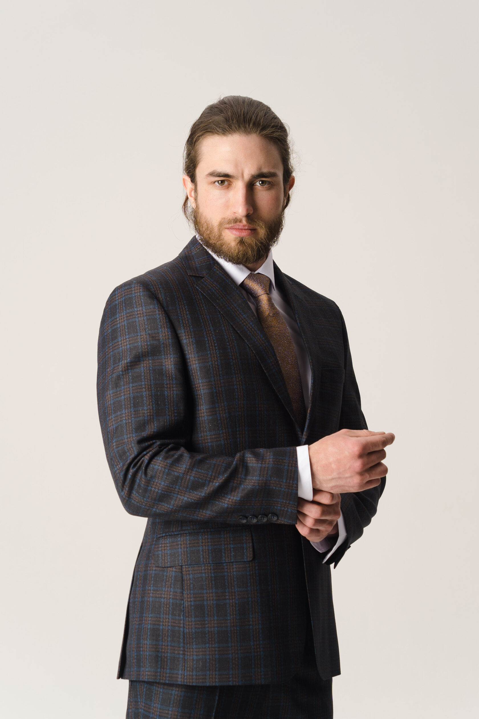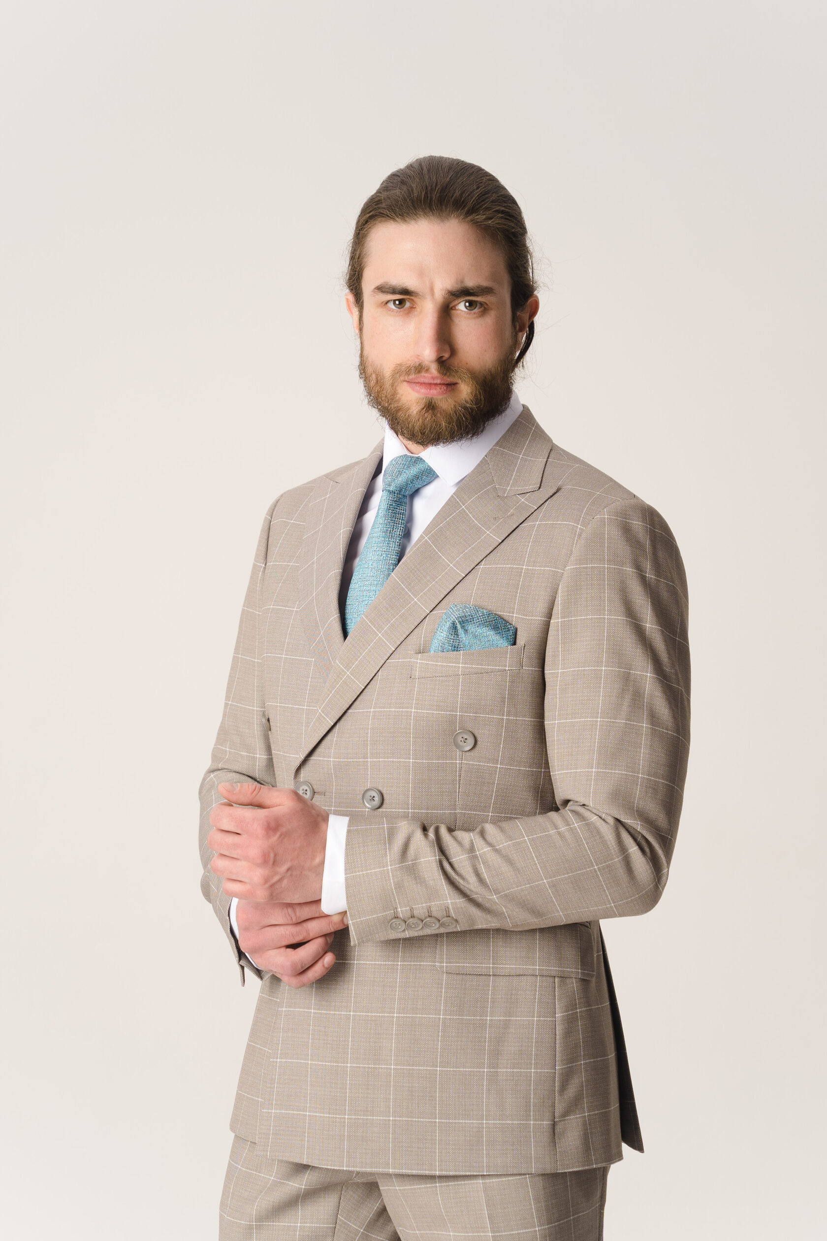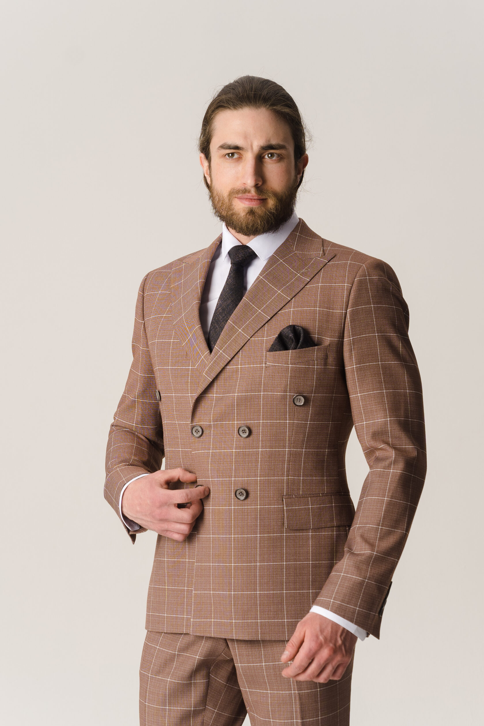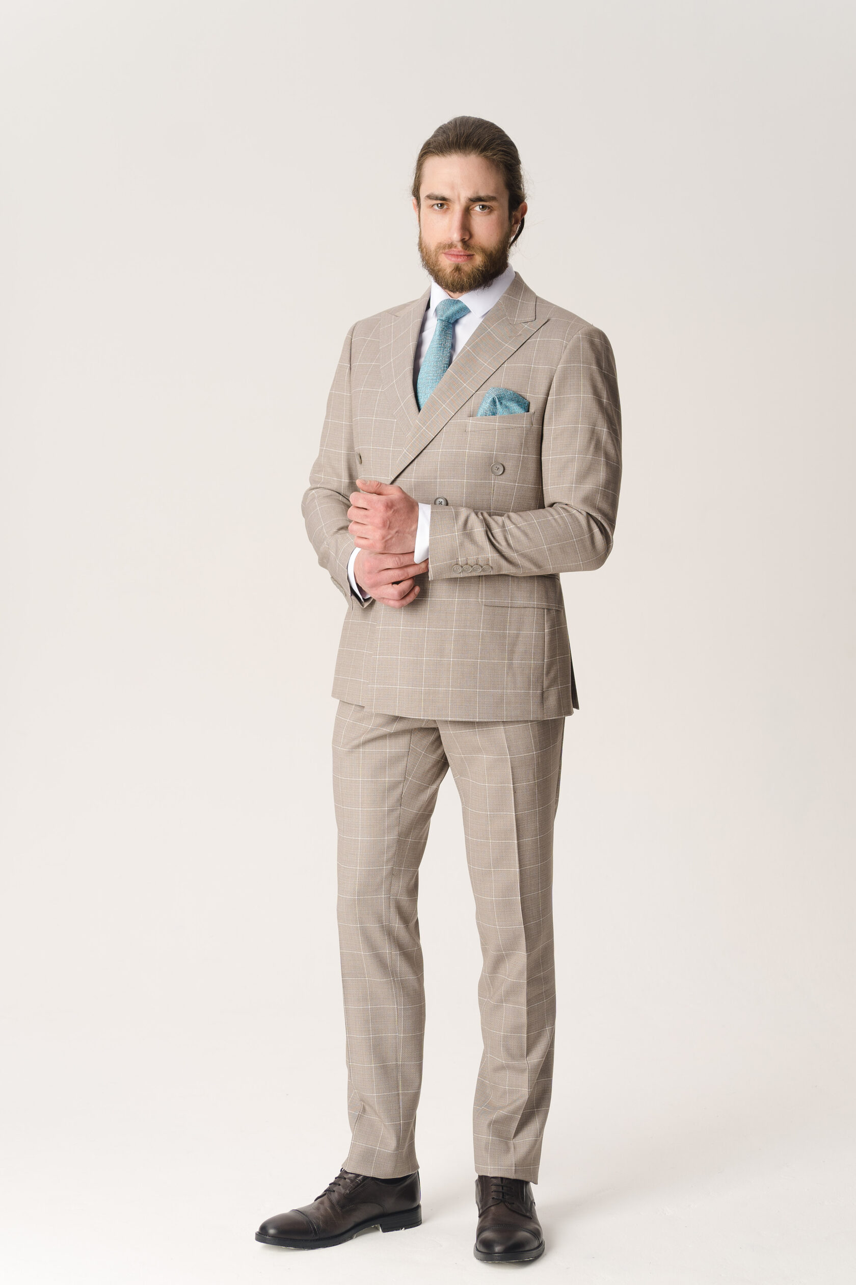 Костюм двойка - двубортный бежевый в клетку
