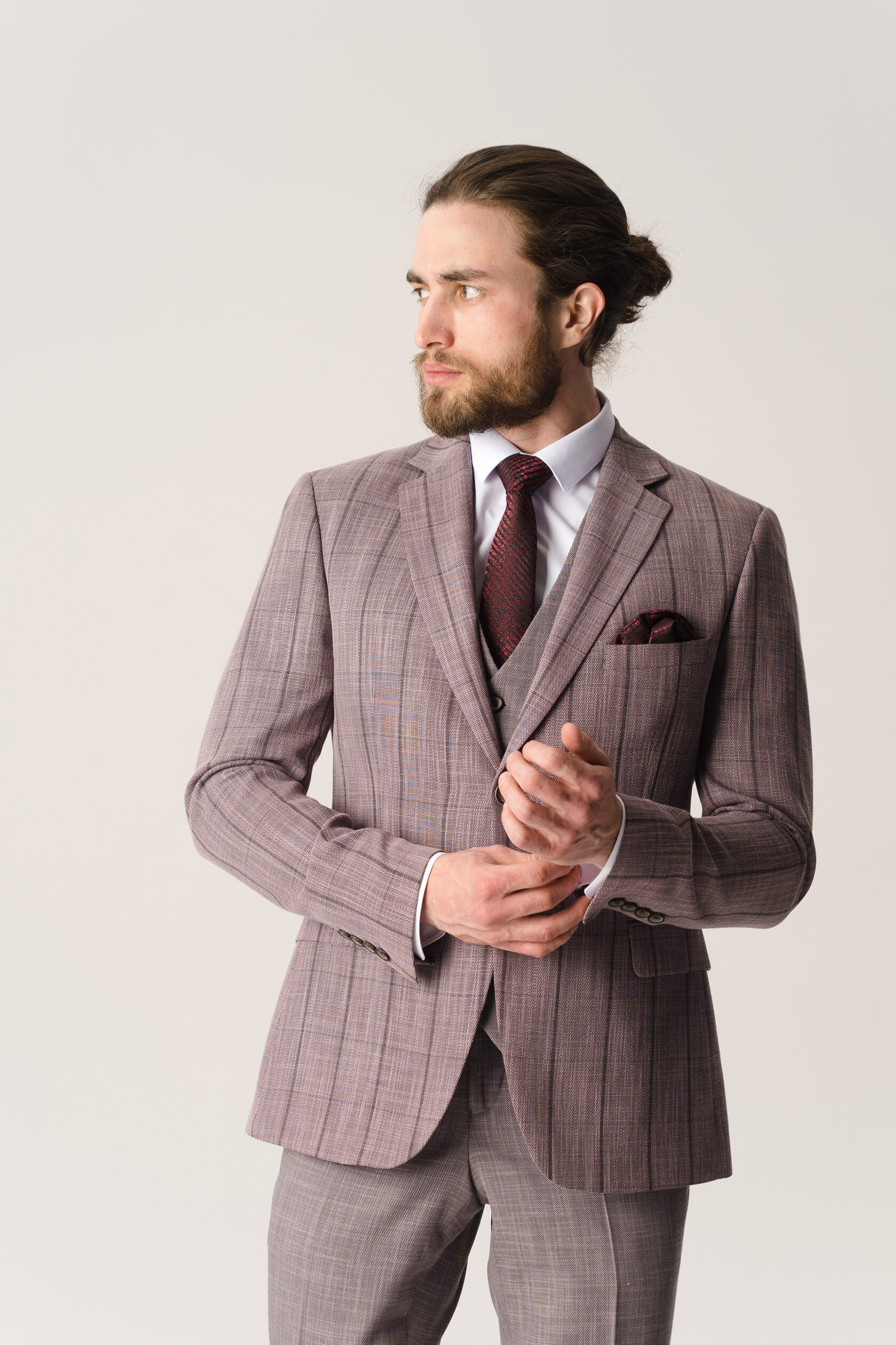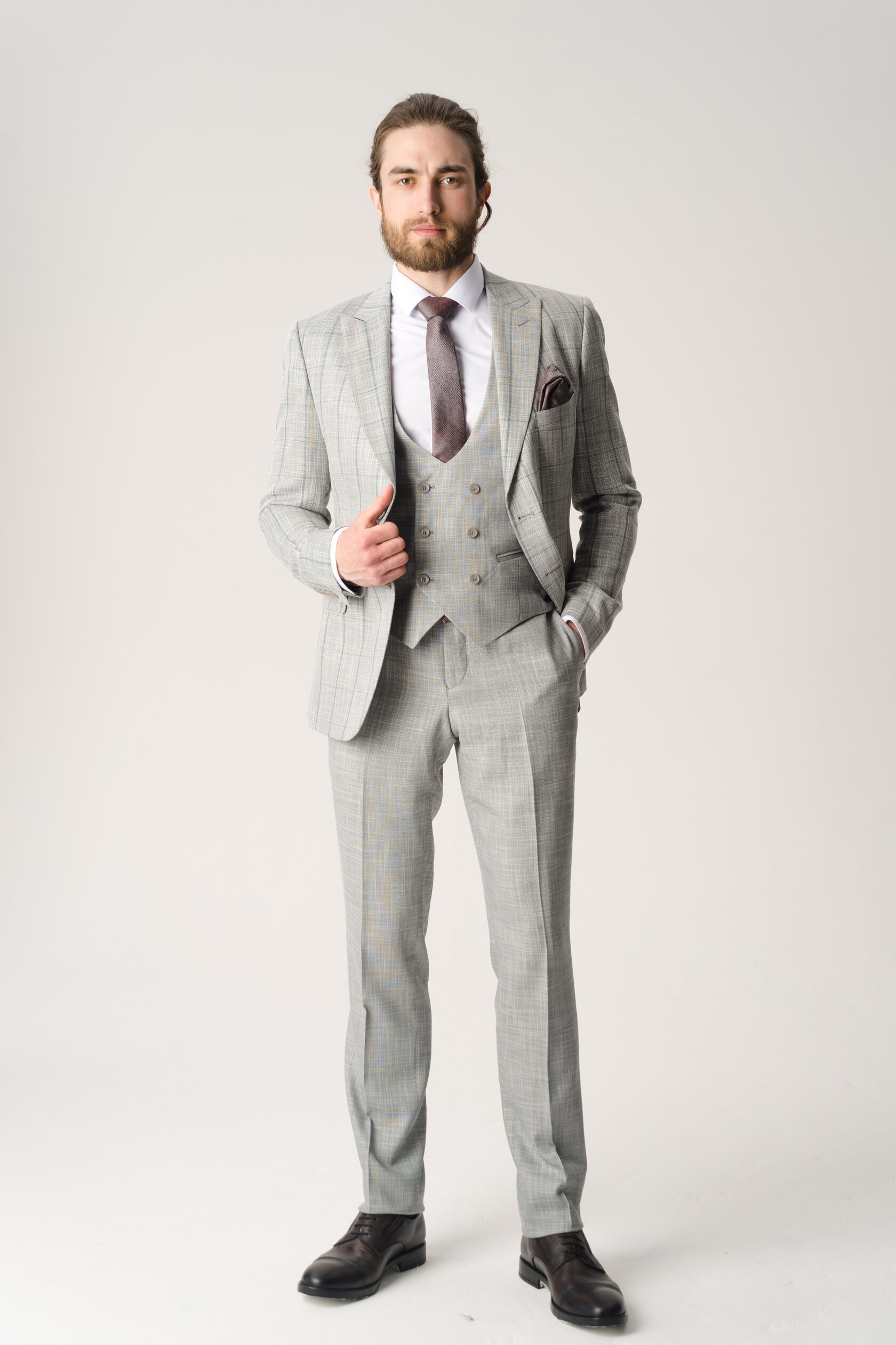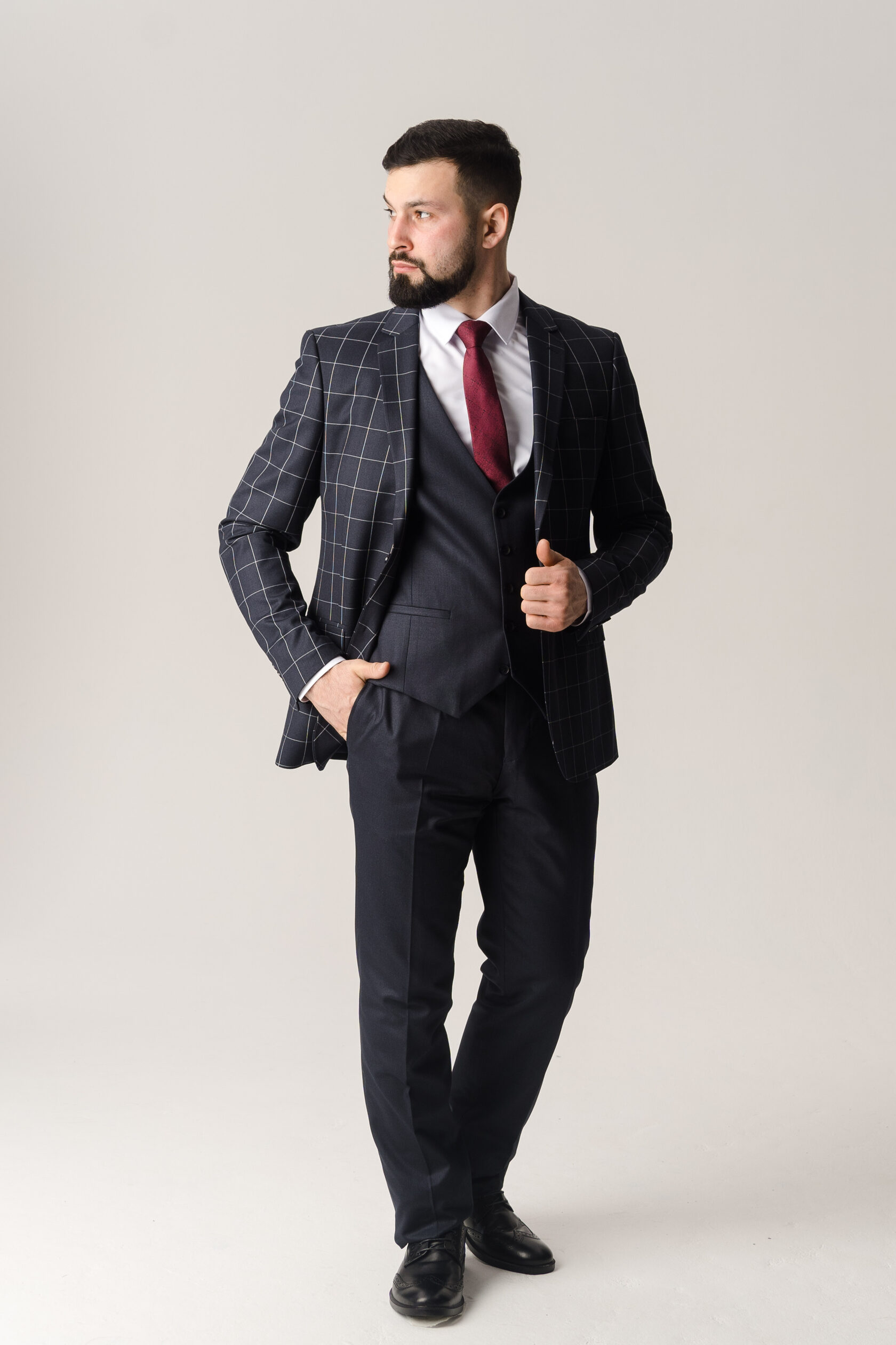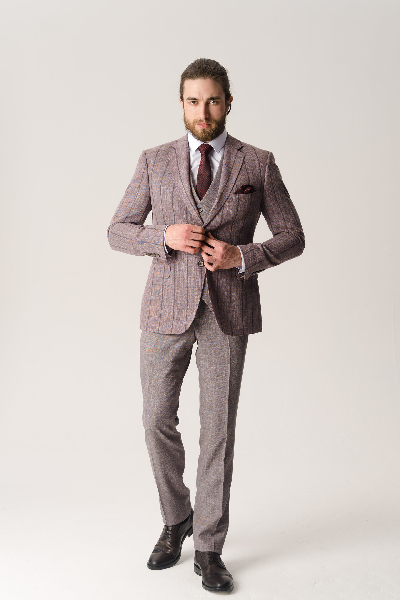 Костюм тройка серый в бордовую клетку