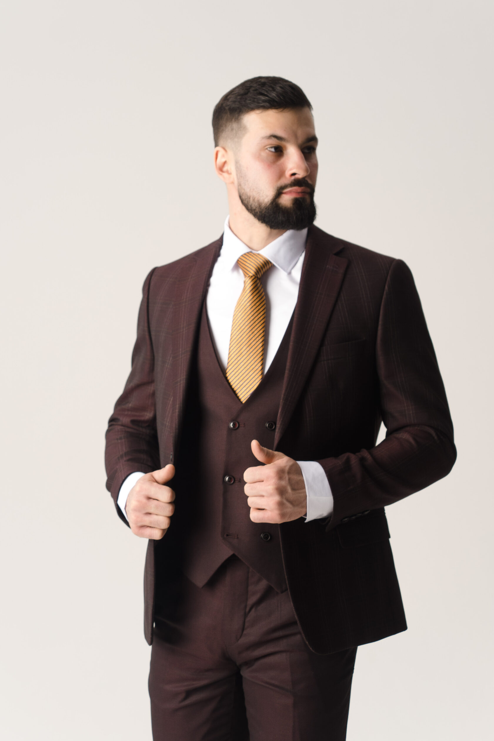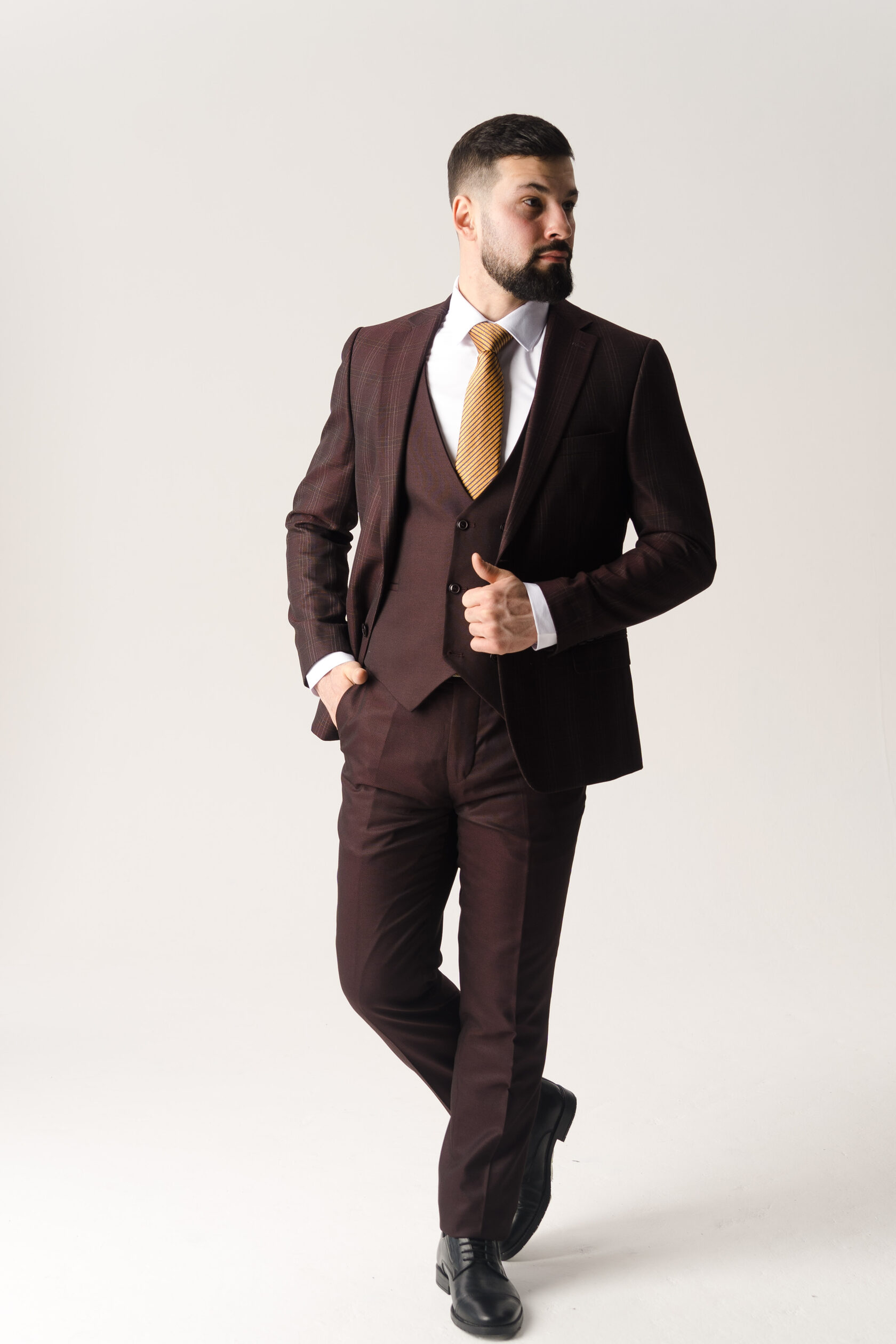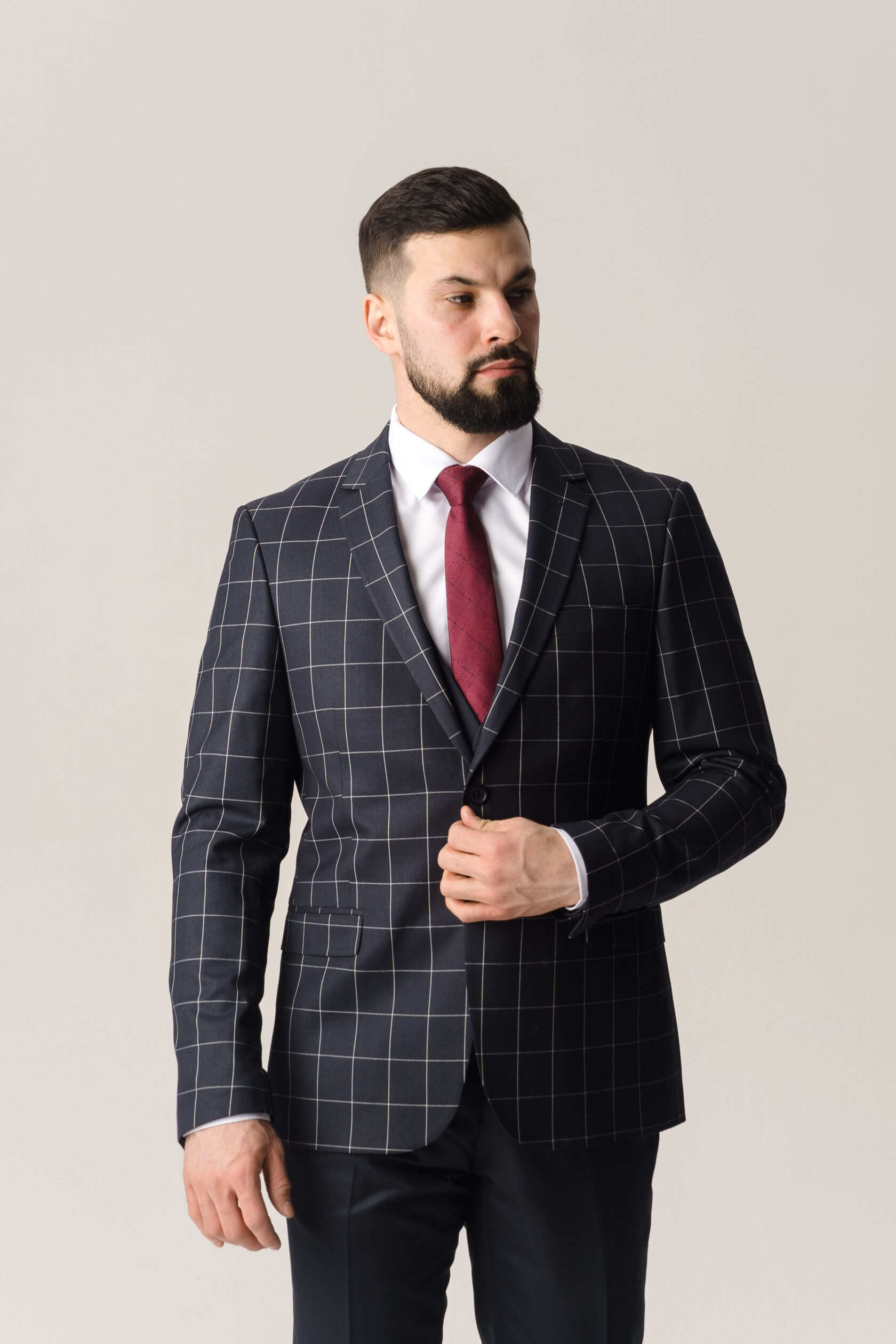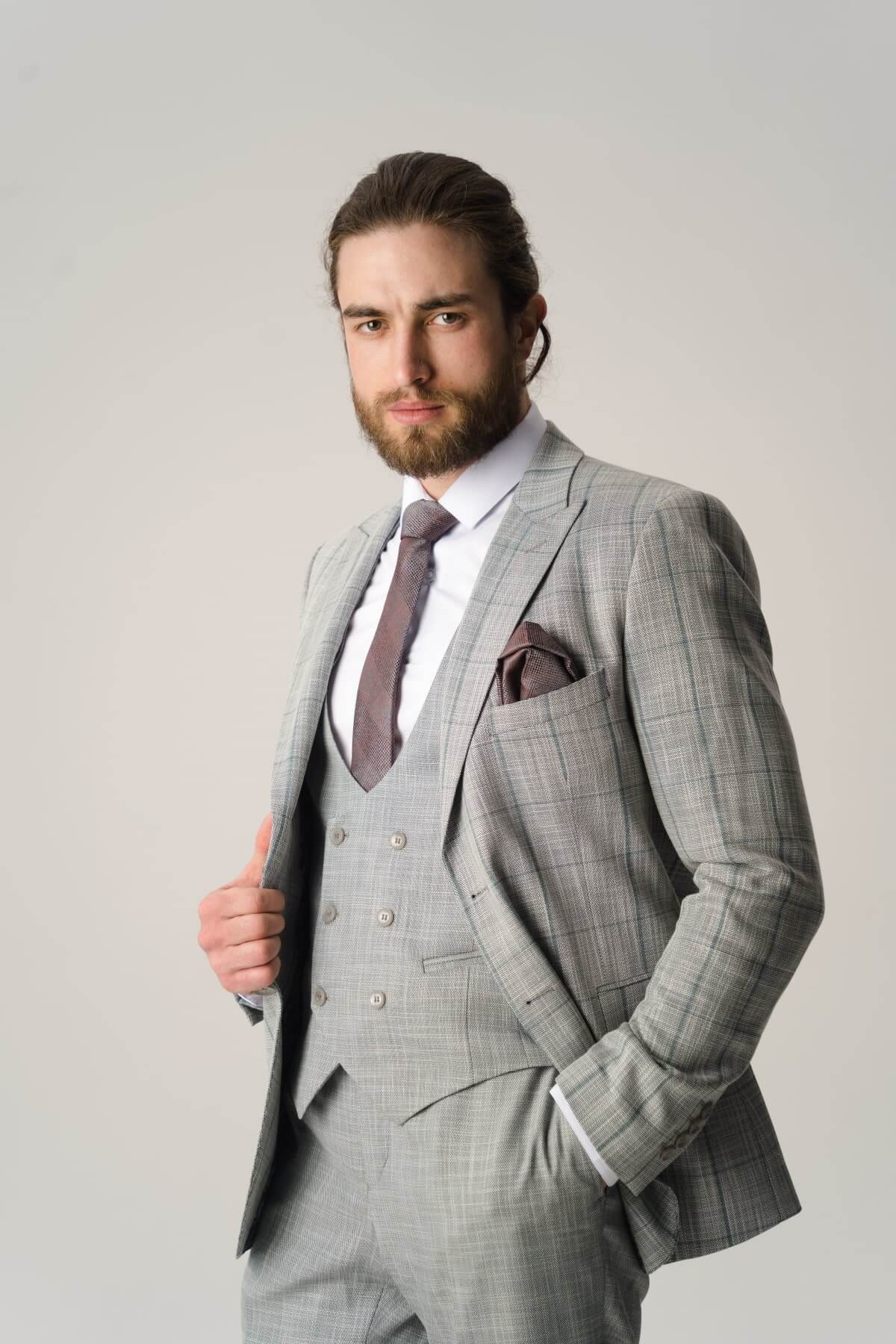 Костюм тройка серый в бордовую клетку