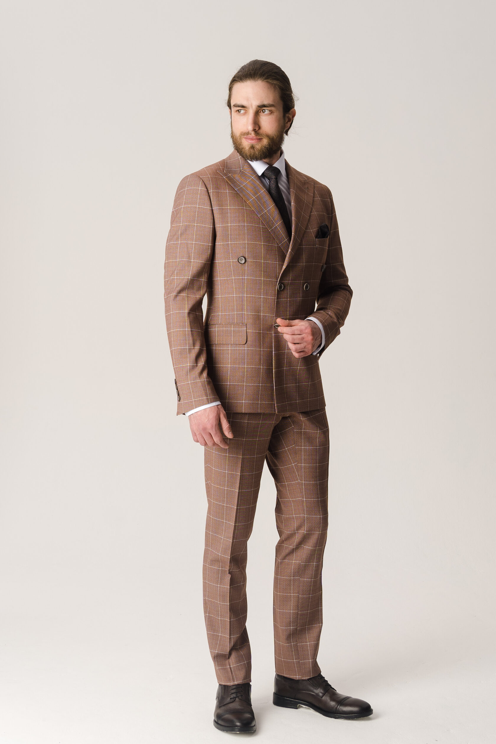 Костюм двойка - двубортный светло-коричневый в клетку